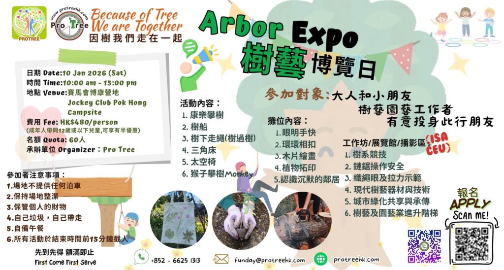 樹藝博覽日Arbor Expo 2026 這是一場專為樹木愛好者打造的「樹藝博覽日」!將於2026年1月10日(週六)在沙田博康女童軍營地舉行。活動內容豐富,包括刺激的康樂攀樹、樹船體驗,以及多項樹藝工作坊和攤位遊戲,適合大人小孩一同參與。現場更有專業講座分享「運動與心靈」主題。名額僅60位,費用每位480港元(成年人帶同12歲或以下兒童,可享有半優惠),機會難得,立即掃描海報上的QR Code或點CLIKC下面直接報名,親近自然,感受樹木帶來的樂趣! 前往方法:點CLICK**營地不設泊車泊車最近停車場參考 : 水泉澳廣場停車場 報名方法: 點CLICK